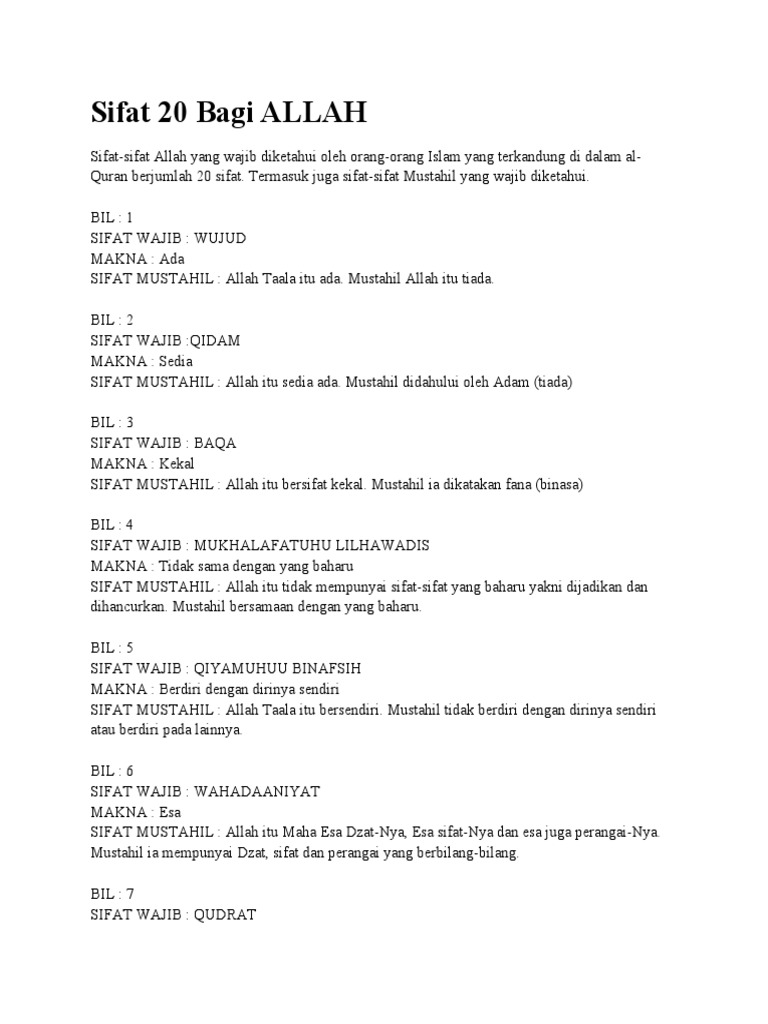 Wajib bagi setiap mukallaf dan muslim mempercayai bahawa terdapat beberapa sifat kesempurnaan yang tidak terhingga bagi allah. Kaunuhu qadiran (keadaan allah yang maha berkuasa). Sifat 20 bagi allah penjelasan sifat wujud allah majelis al bahjah di at taqwa 23 okt 2017. 20 sifat wajib bagi allah dan artinya dulu biasanya sambil nunggu imam datang ngelafadz kan ini. 20 sifat wajib bagi allah mp3 & mp4.